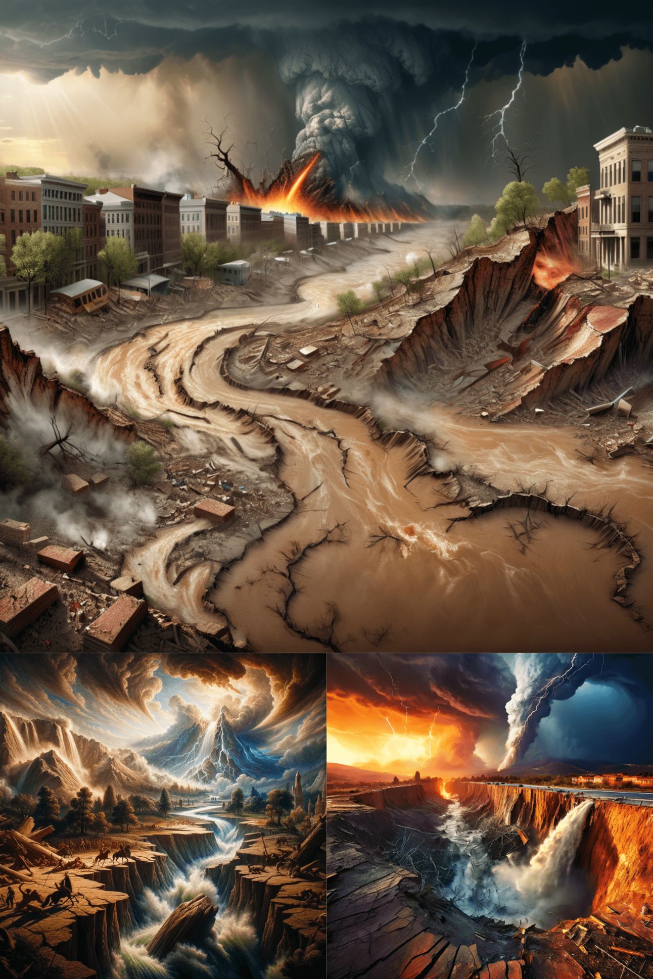 Prompt: A dramatic depiction of the New Madrid earthquake, illustrating the powerful forces at work as the earth cracks open, rivers change course, and the landscape is irrevocably altered. The scene captures the moment of upheaval and the raw power of nature.