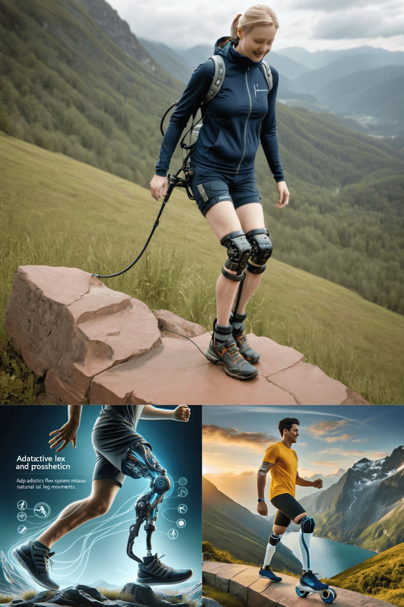 Dall-E Prompt: An advanced leg prosthetic, the FlexiStep, showcased in action, highlighting its adaptive flex system that mimics natural leg movements. The image depicts the prosthetic on a user, demonstrating ease of movement across varied terrains, embodying innovation in mobility assistance.