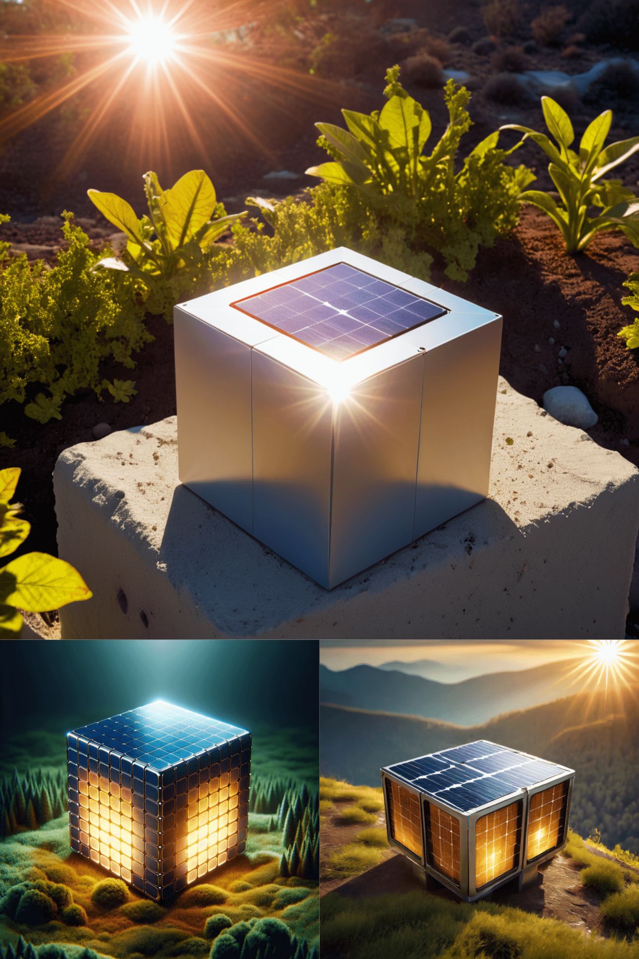 Prompt: "A sleek, cube-shaped solar energy device, the Solara Cube, glowing with absorbed sunlight. It's depicted on a background that contrasts its high-tech design with a natural setting, symbolizing the blend of innovation and sustainability."