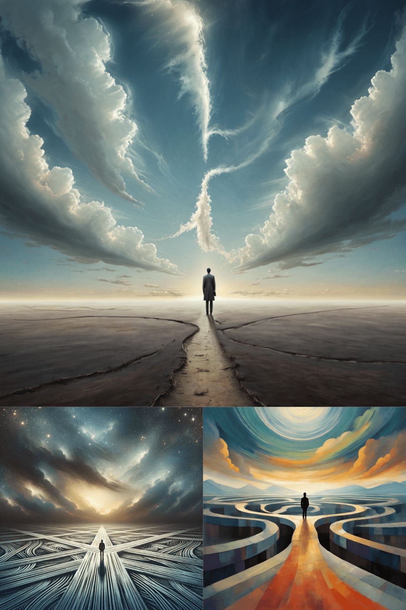 Prompt: An abstract representation of existentialism, featuring a solitary figure standing at the crossroads of myriad paths, under a vast, indifferent sky. The scene symbolizes the essence of choice, freedom, and personal responsibility in defining one’s own meaning in life.