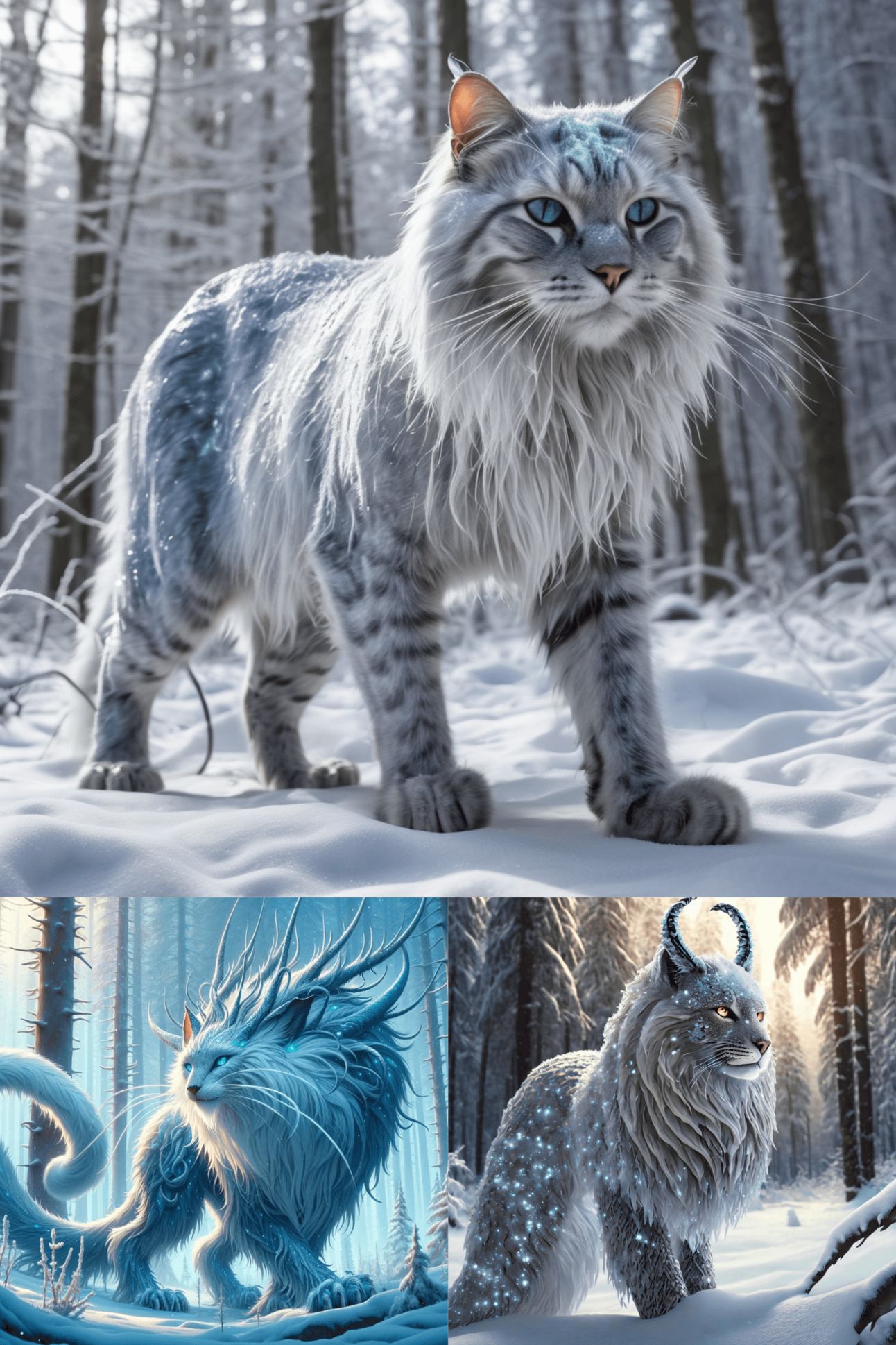 Image Prompt: "A large feline-like mythical creature with shimmering, frost-like fur and elongated whiskers in a snowy forest landscape