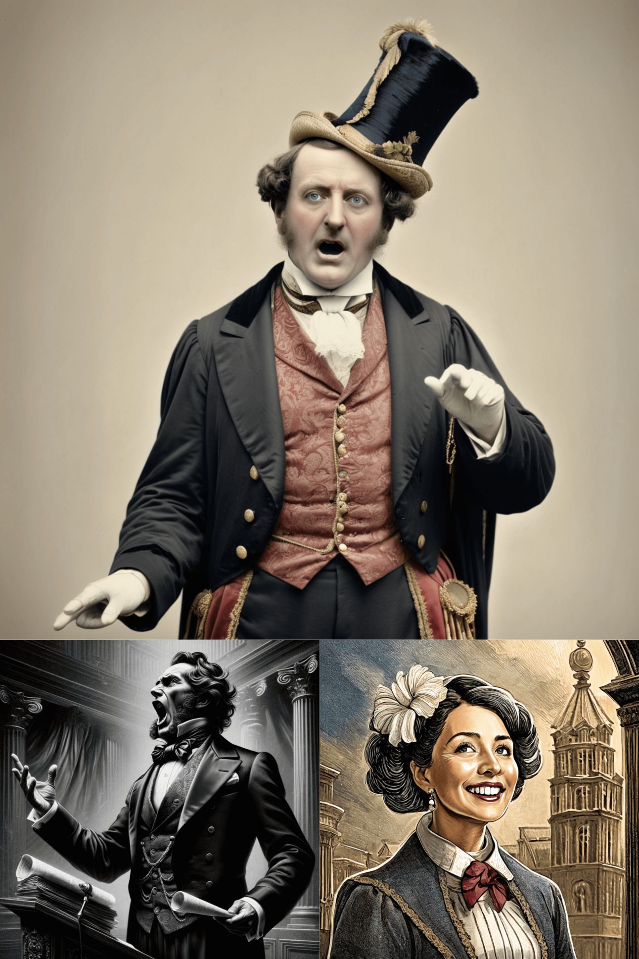 Prompt for Image: An elegantly dressed orator from the 19th century, dramatically delivering a speech, embodying the concept of 'Fustian' in both attire and action.