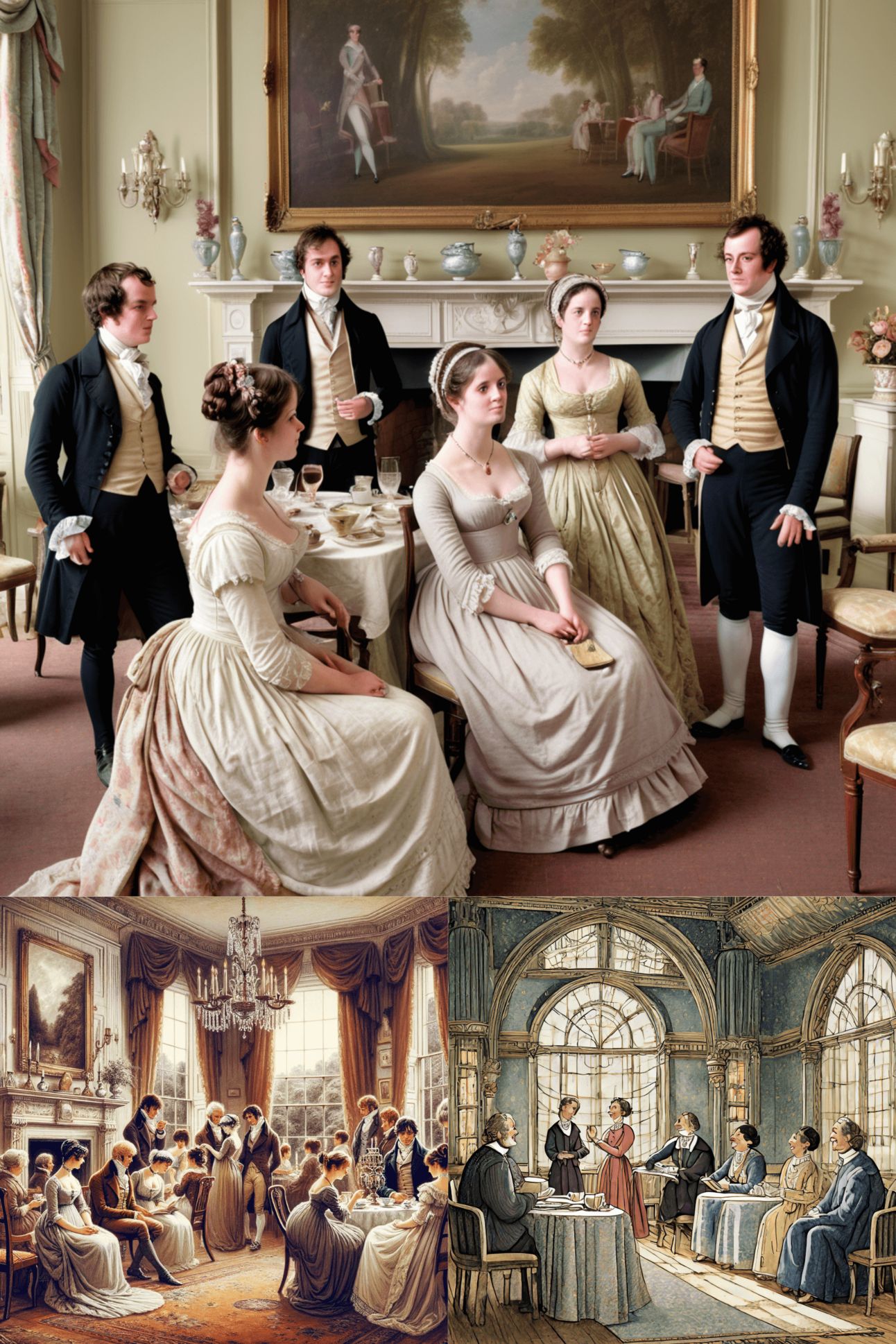 Prompt for Image: An 1800s drawing room scene depicting a social gathering, reminiscent of a scene from 'Pride and Prejudice', with characters in period attire engaged in conversation, embodying the essence of Jane Austen's world.