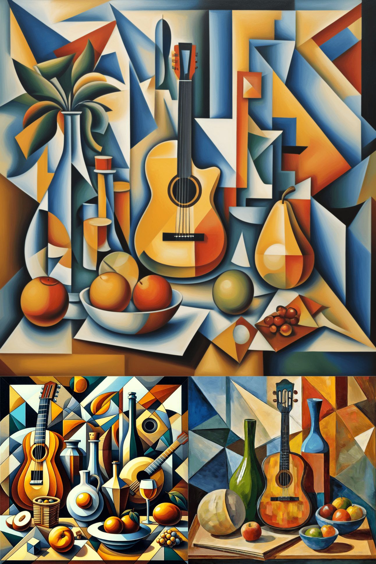 Prompt for Image: A still life painting in the Cubism style, featuring geometric shapes and multiple perspectives, with objects like a guitar, a bottle, and a fruit bowl.