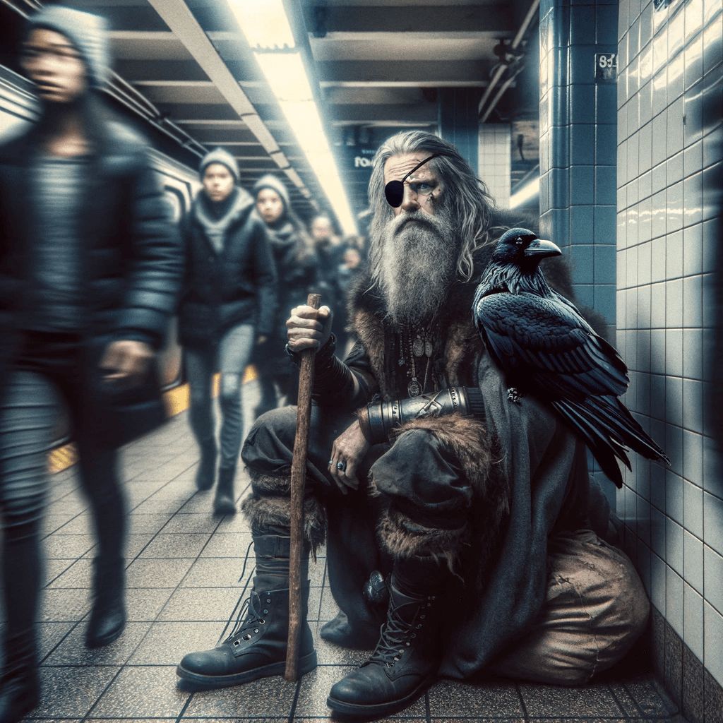 Image Prompt: Visualize the Norse god Odin portrayed as a homeless man in a New York City subway. Odin is characterized by an eyepatch and one of his ravens perched on his shoulder. The scene is captured as if through the lens of an iPhone, with blurred pedestrians walking past him, emphasizing his isolation and the bustling city life around him. He sits on the sidewalk, looking forgotten and overlooked, a striking symbol of the disregard for tradition in the face of late-stage capitalism. The image should capture the contrast between the mythological figure and the modern, urban environment, highlighting the poignant theme of neglect in a fast-paced world.