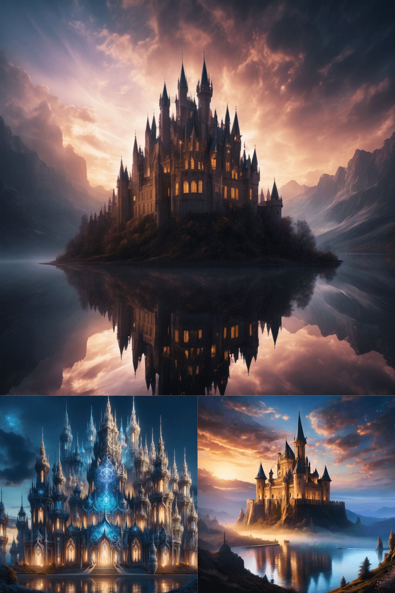 Prompt for Image: A fantastical castle that appears to be made of light and shadows, shimmering against a twilight sky, exuding an aura of mystery and allure.