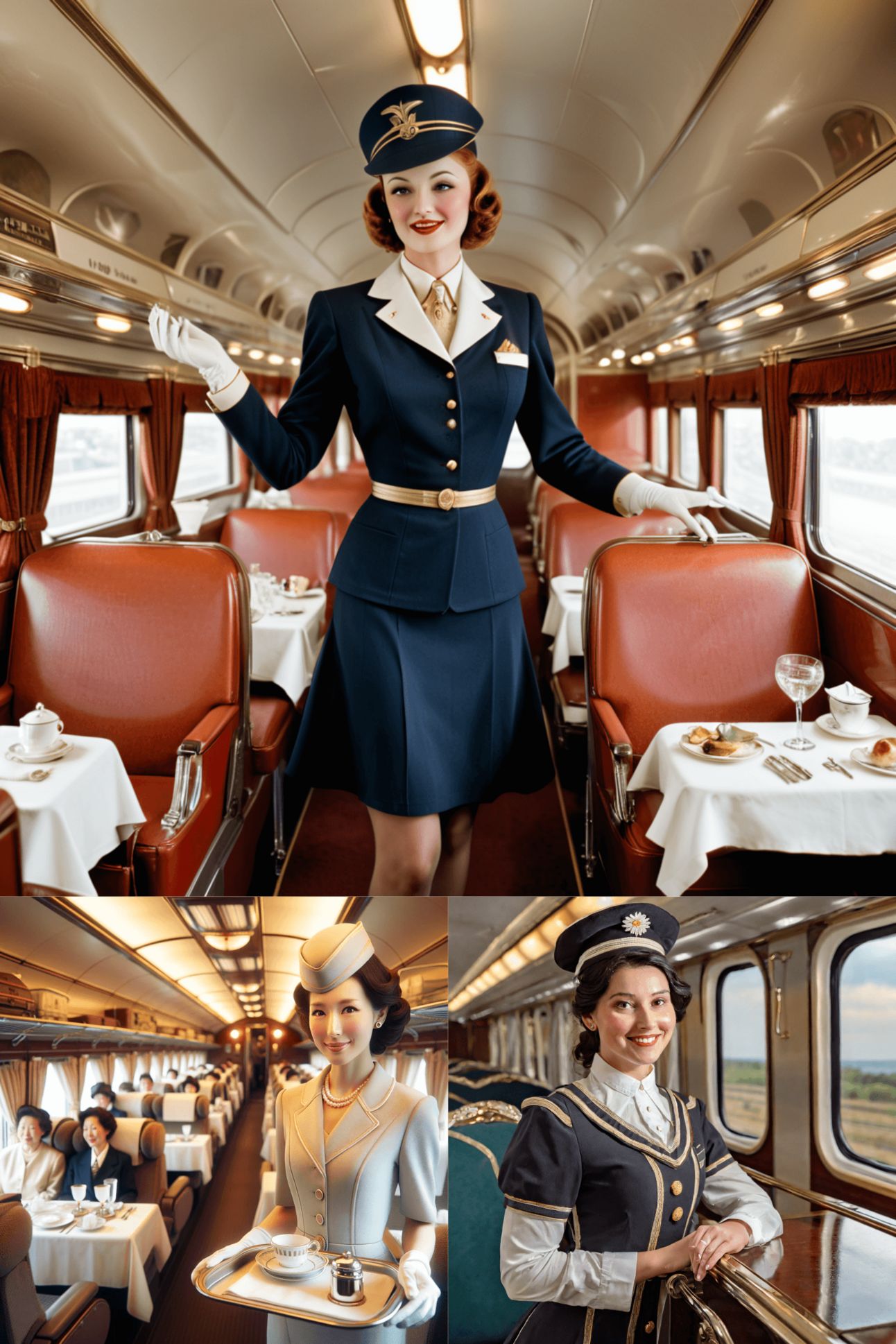 Image Prompt: A Zephyrette in her elegant uniform, serving passengers in the luxurious interior of a mid-20th century Zephyr train.