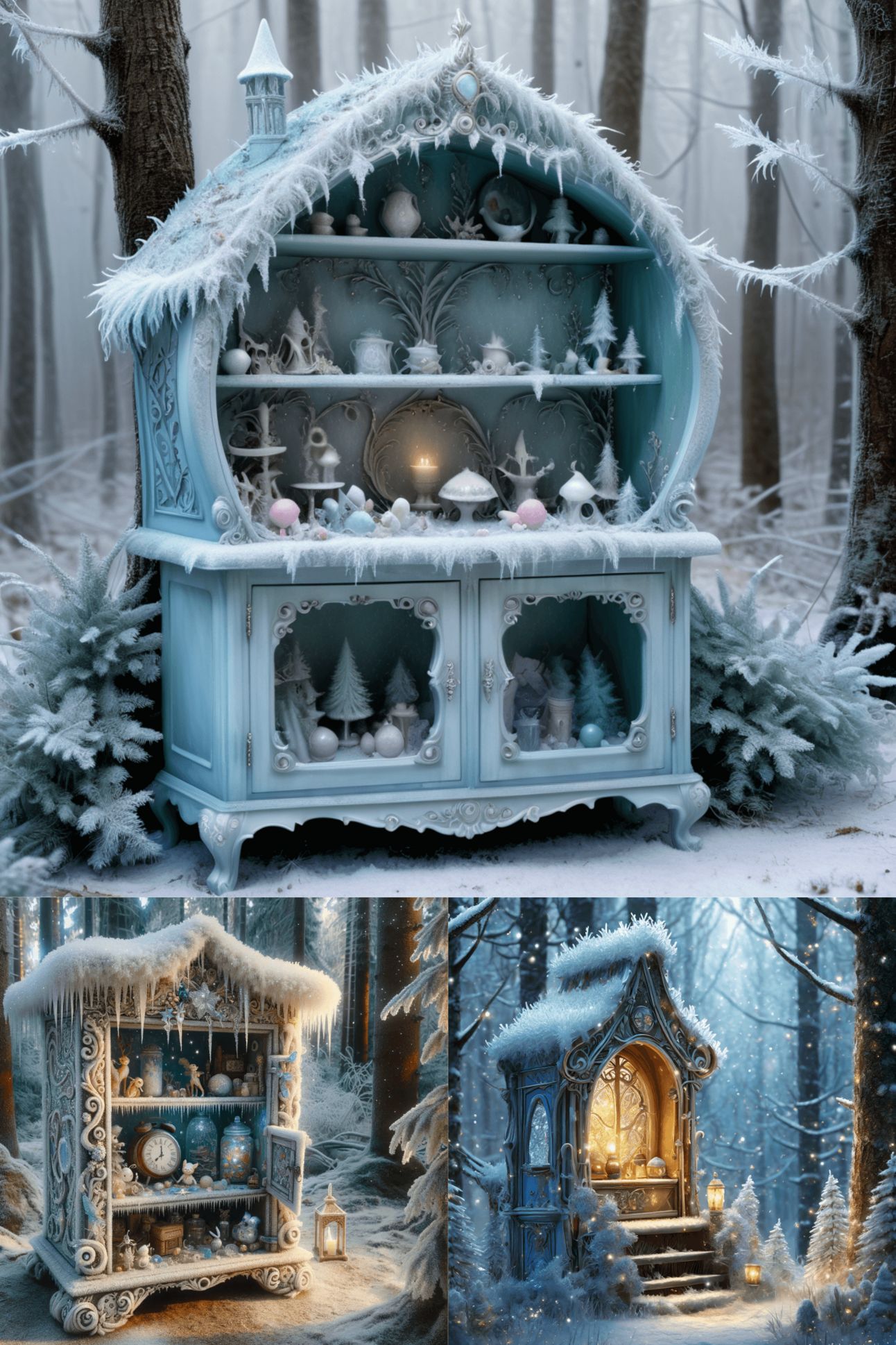 Image Prompt: A WhimsicalFrostCabinet in a magical forest setting, covered in sparkling frost and containing various enchanted objects.