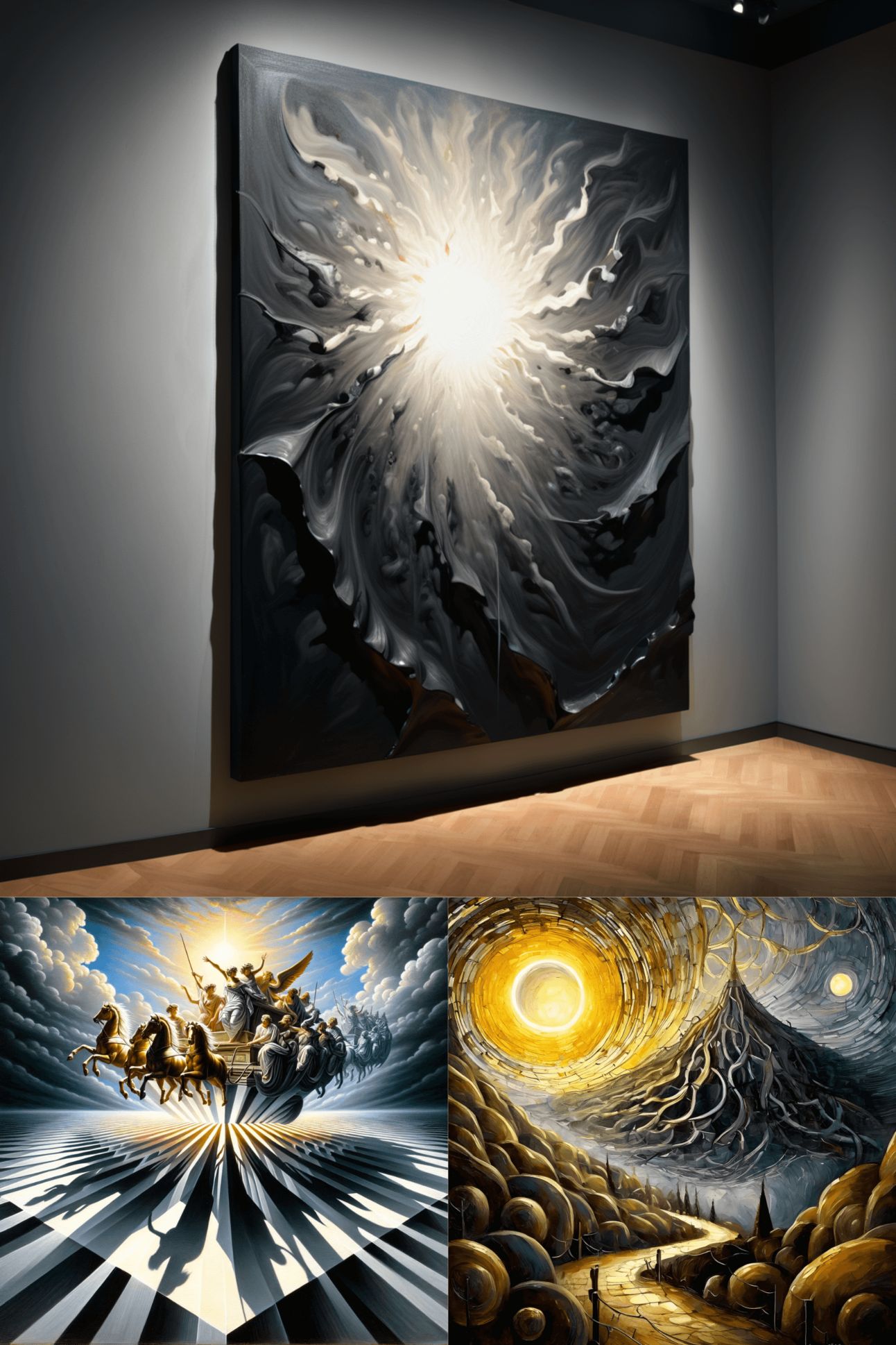 Chiaroscurism is an imagined art movement inspired by the chiaroscuro technique, where dramatic contrasts of light and dark create a striking, three-dimensional effect on flat surfaces. This fictitious movement emphasizes extreme contrasts, creating artworks that appear to move and shift in the viewer's perception, playing tricks on the eye and evoking a sense of mystery.